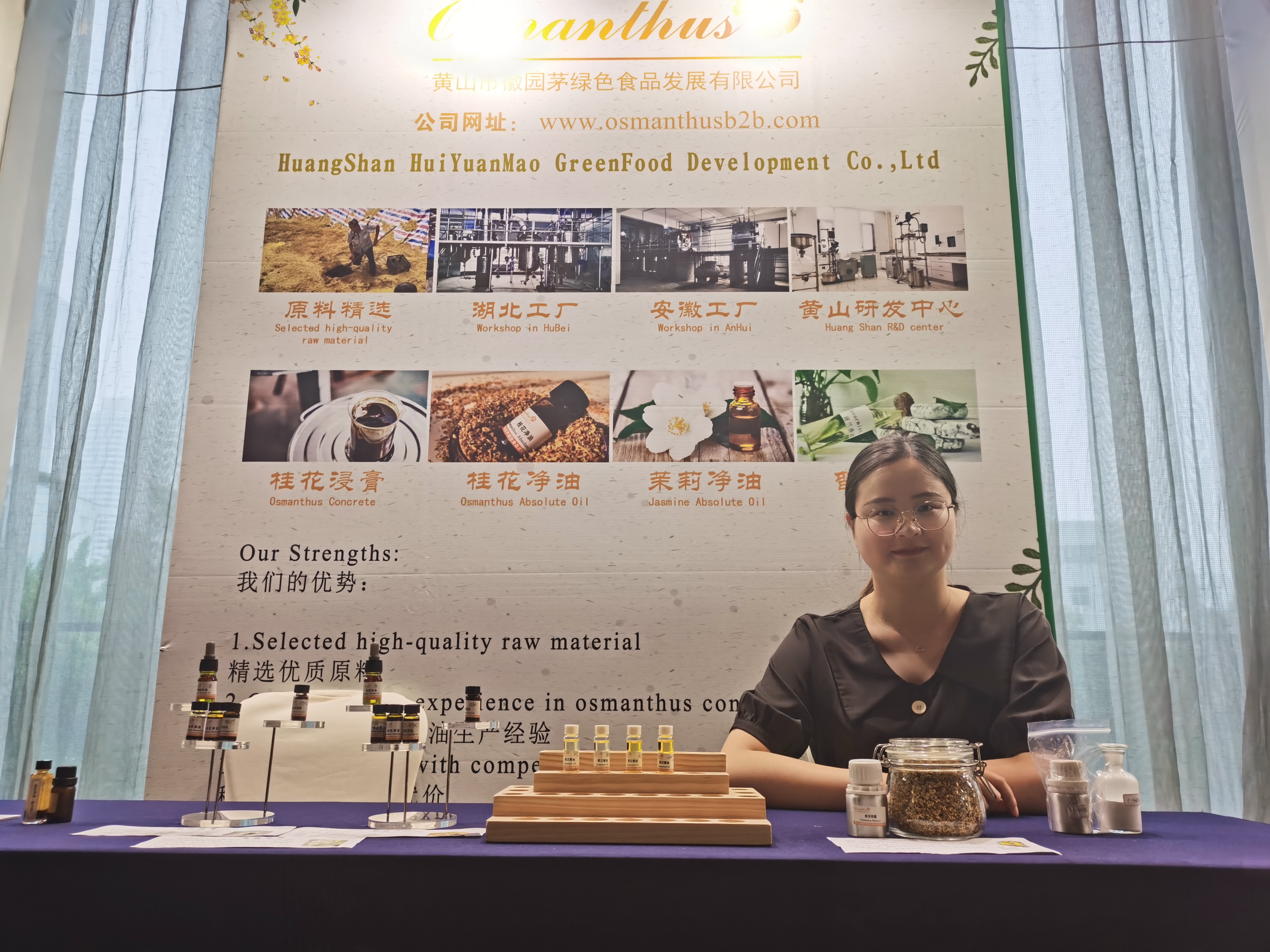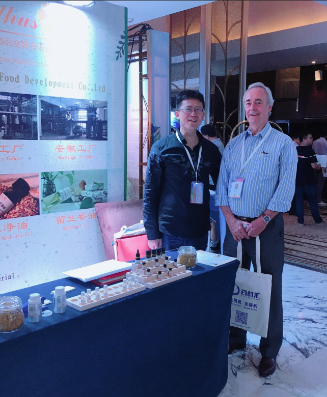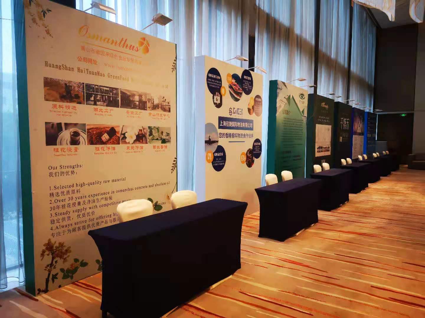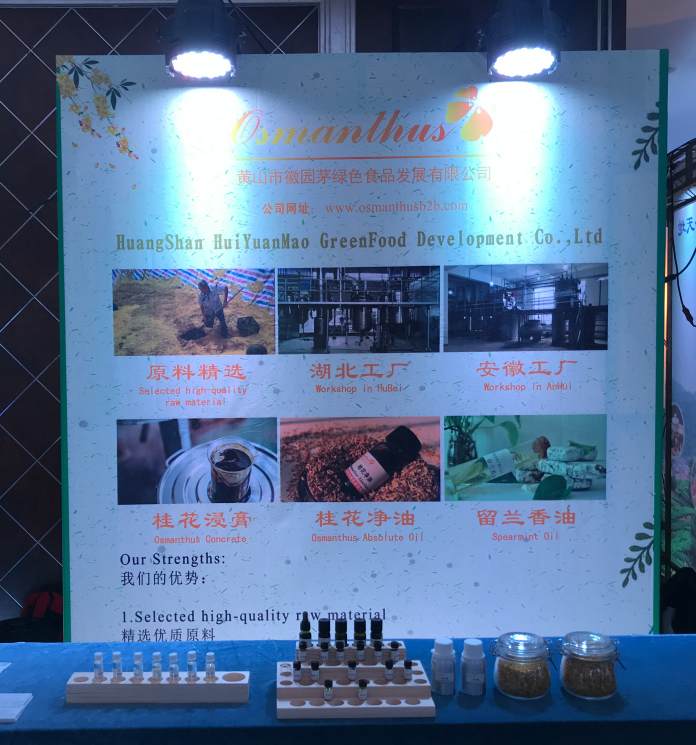 黃山市徽園茅綠色食品發(fā)展有限公司作為此次會(huì)議的卡包贊助商,在我們自己的展位上展示了我們的主營業(yè)務(wù)產(chǎn)品桂花系列產(chǎn)品:桂花浸膏、桂花凈油、桂花純露。我司憑借優(yōu)質(zhì)的產(chǎn)品質(zhì)量,甜美的桂花香氣以及及時(shí)的售后服務(wù)在國內(nèi)外客戶中贏得了良好的口碑。在此次展會(huì)上,我司也吸引了許多國內(nèi)外客戶來咨詢產(chǎn)品并獲得了良好的產(chǎn)品評價(jià),而且結(jié)識(shí)了許多行業(yè)內(nèi)的新朋友。我司誠摯歡迎各位業(yè)內(nèi)人士咨詢我們產(chǎn)品,與我們攜手合作,讓中國特有的桂花走向世界,讓桂花香飄滿世界各個(gè)角落。